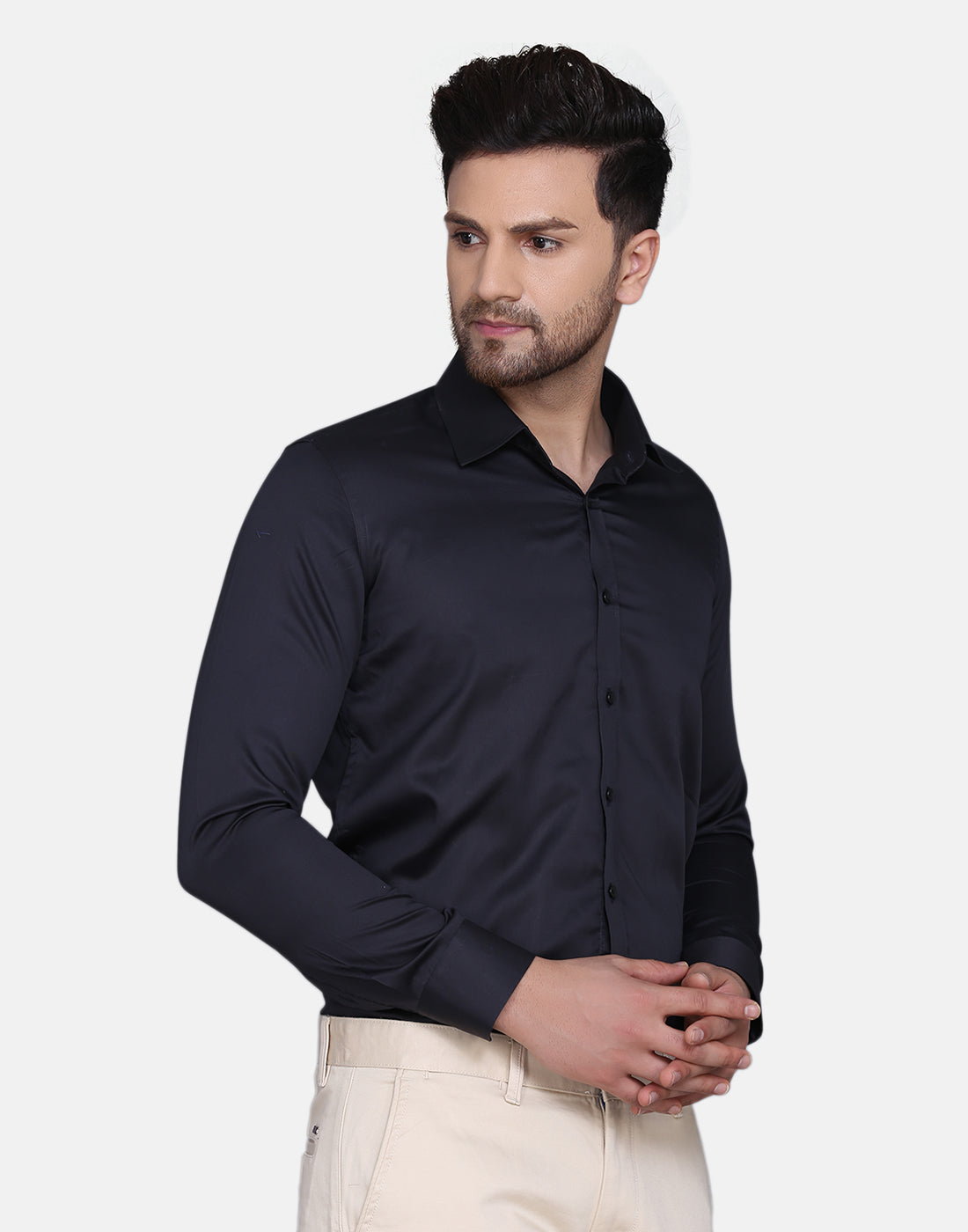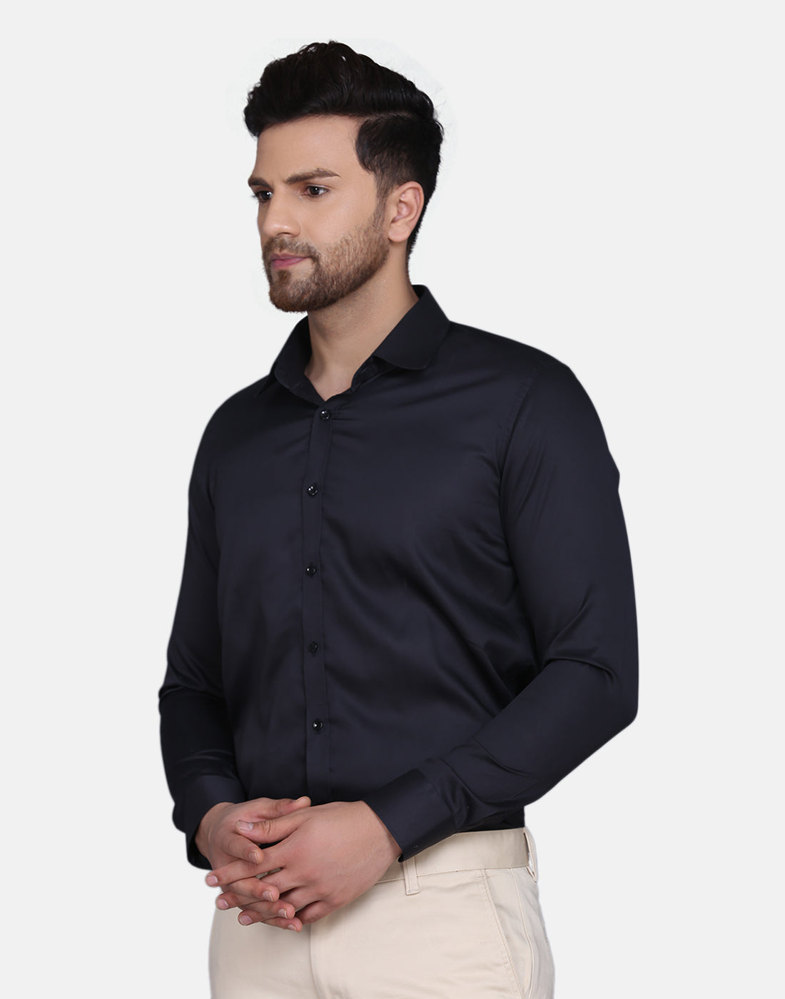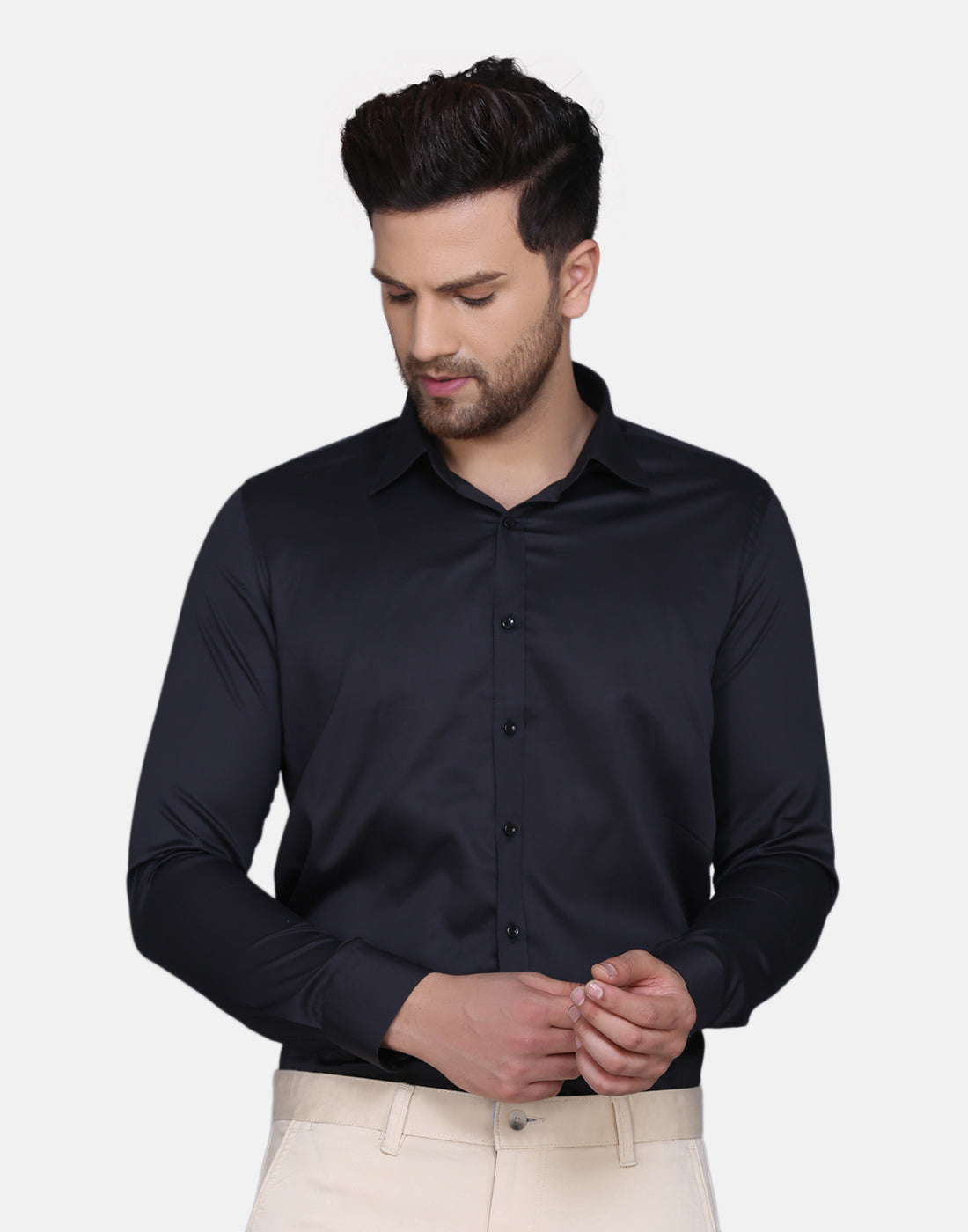 Cotton satin solid formal shirt, has a spread collar, long sleeves, and curved hem this black piece have taken the global runways by storm, so we thought we'd bring them to your closet as well, with this Very soft hand feel shirt. Get 'in line' with the trend with this bold and statement making style, that is crafted to perfection, with a fit that is just right! Office to the bar, make it work with a pair of formal Trouser or ripped jeans with loafers.