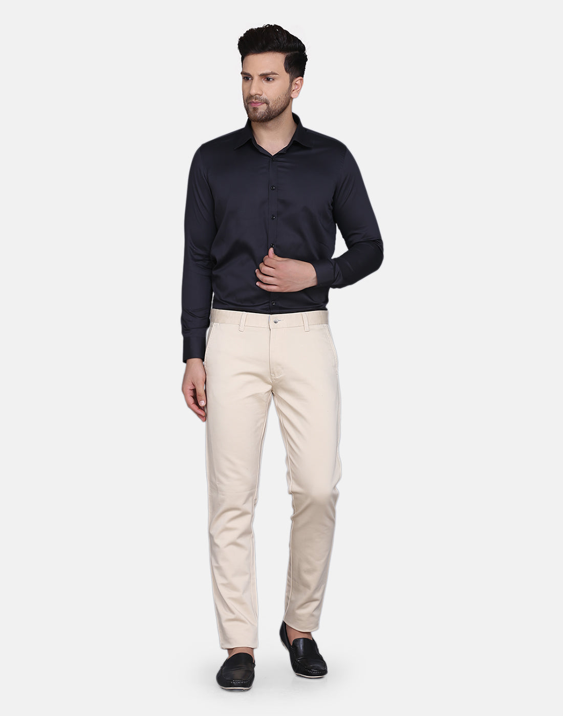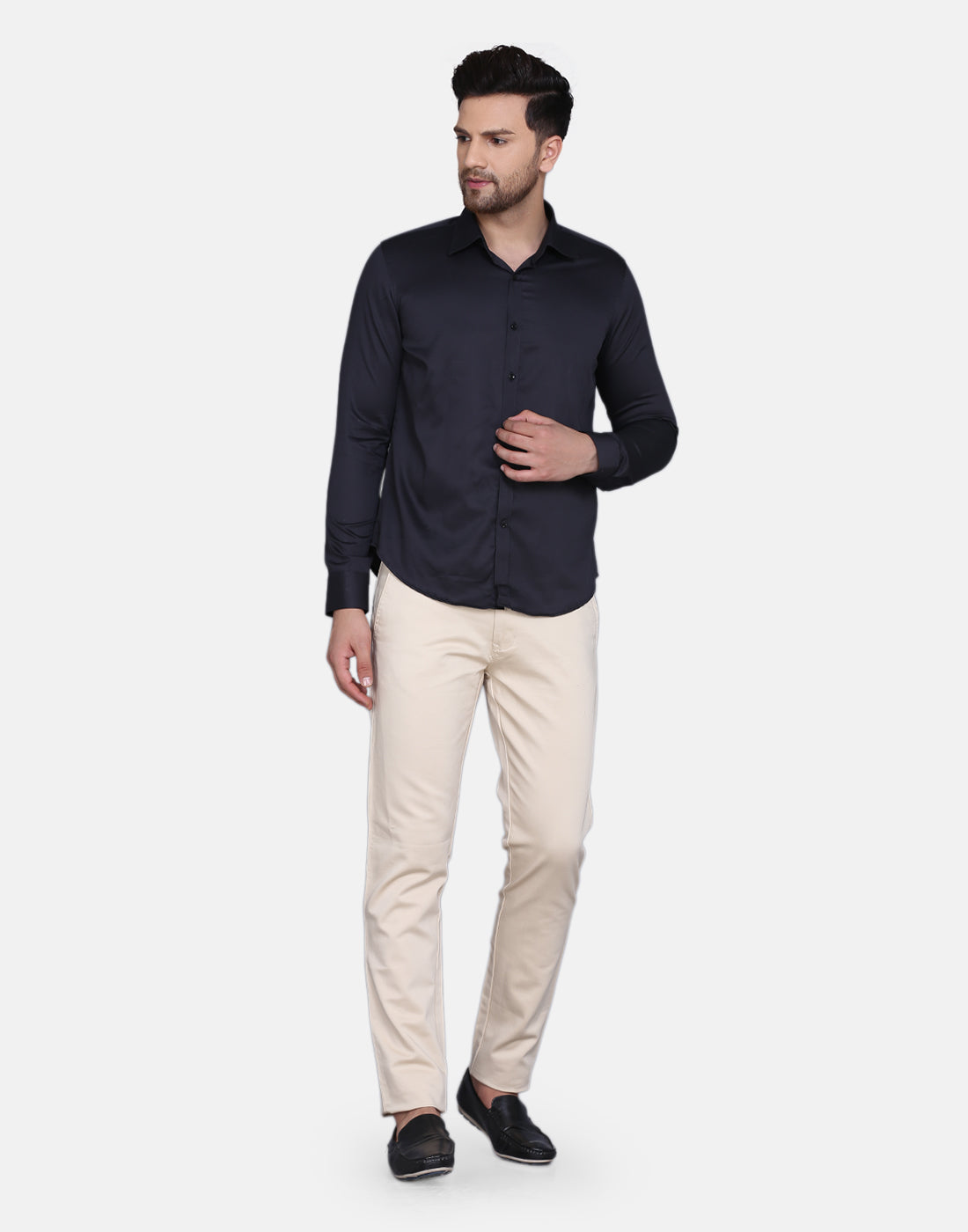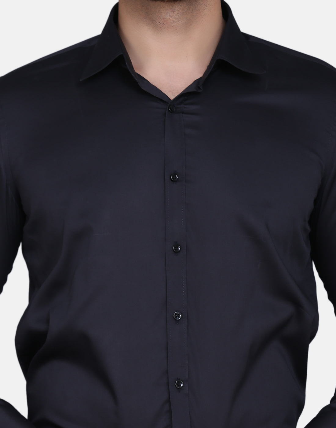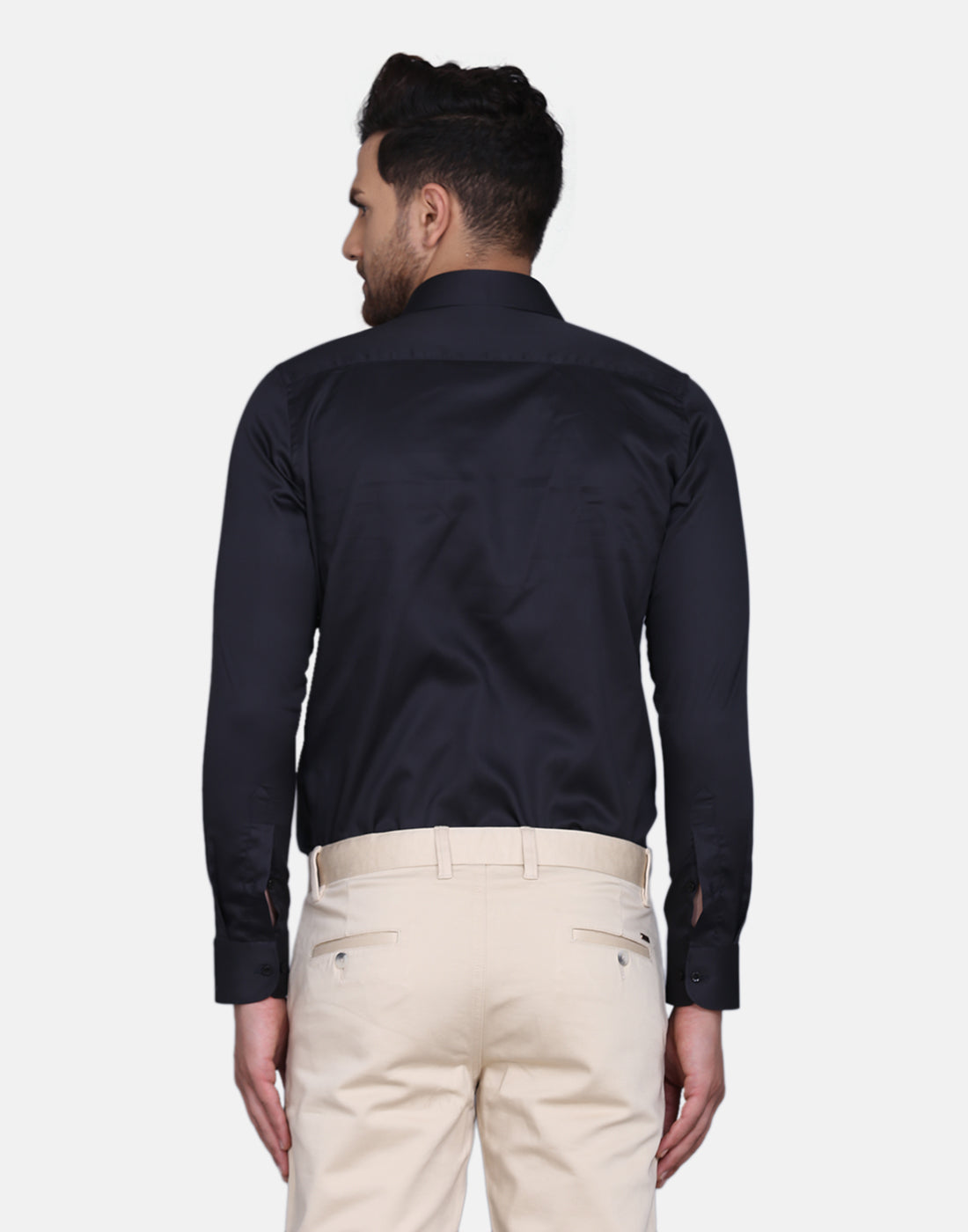 Cotton satin solid formal shirt, has a spread collar, long sleeves, and curved hem this black piece have taken the global runways by storm, so we thought we'd bring them to your closet as well, with this Very soft hand feel shirt. Get 'in line' with the trend with this bold and statement making style, that is crafted to perfection, with a fit that is just right! Office to the bar, make it work with a pair of formal Trouser or ripped jeans with loafers.