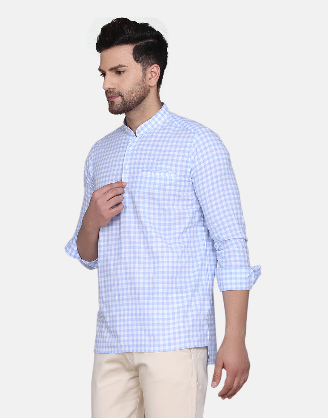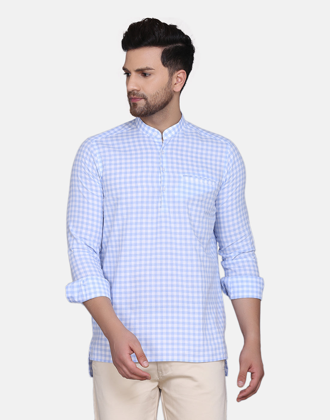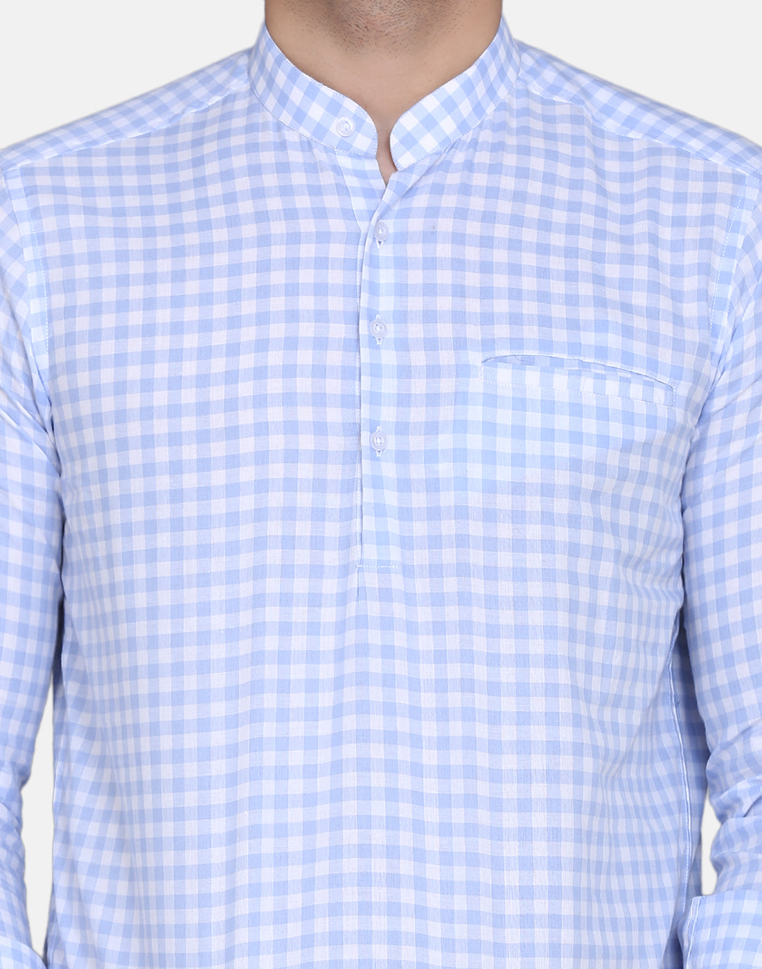 Light Blue checkered straight kurta, has a mandarin collar, long sleeves, straight hem, and low high side slits, Complete your look with this Yarn dyed kurta. Achieve a comfortably chic look for your next dinner party or family outing when you team this blue piece with slim trousers and minimal flair.