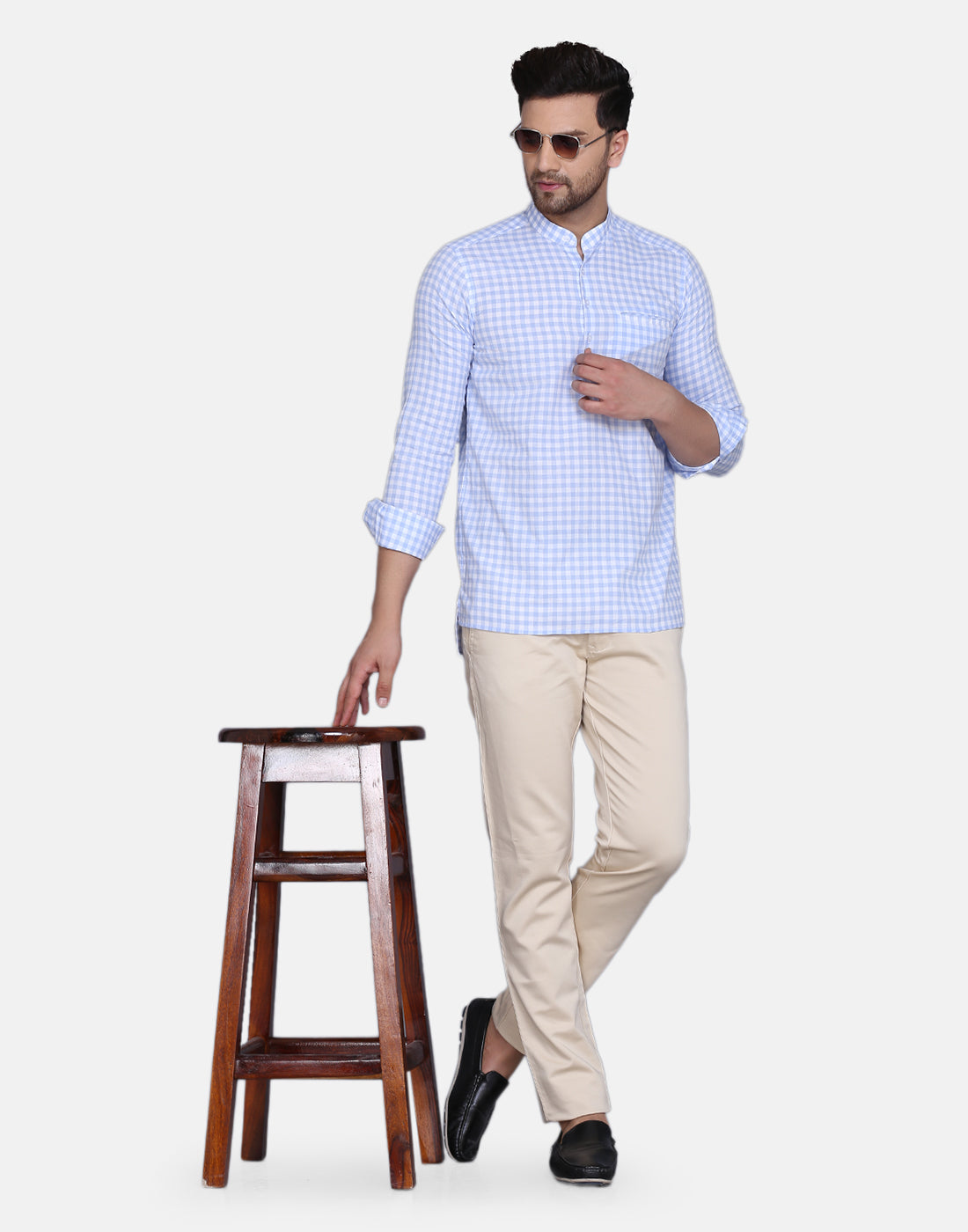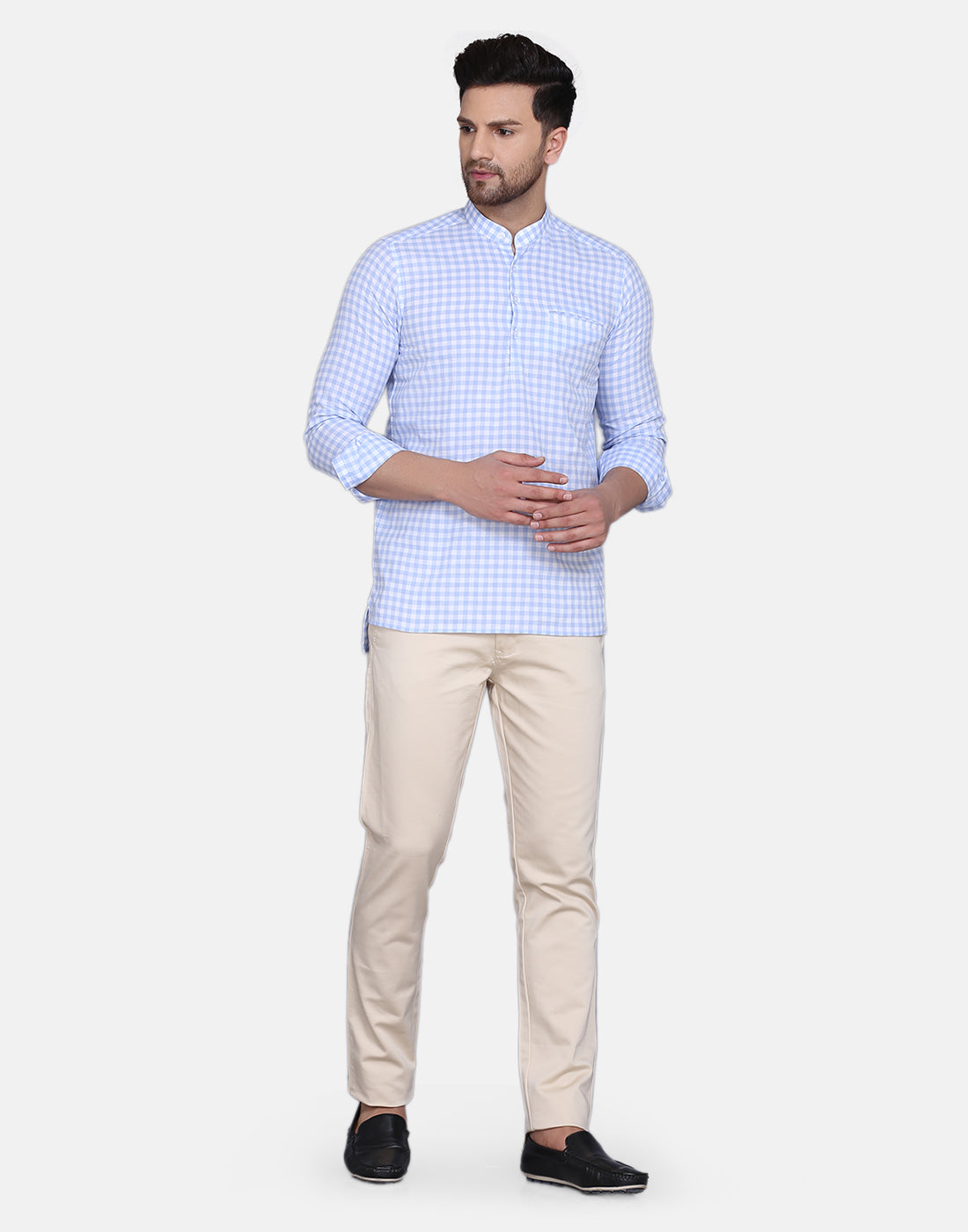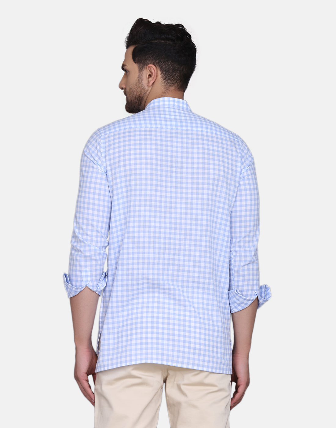 Light Blue checkered straight kurta, has a mandarin collar, long sleeves, straight hem, and low high side slits, Complete your look with this Yarn dyed kurta. Achieve a comfortably chic look for your next dinner party or family outing when you team this blue piece with slim trousers and minimal flair.