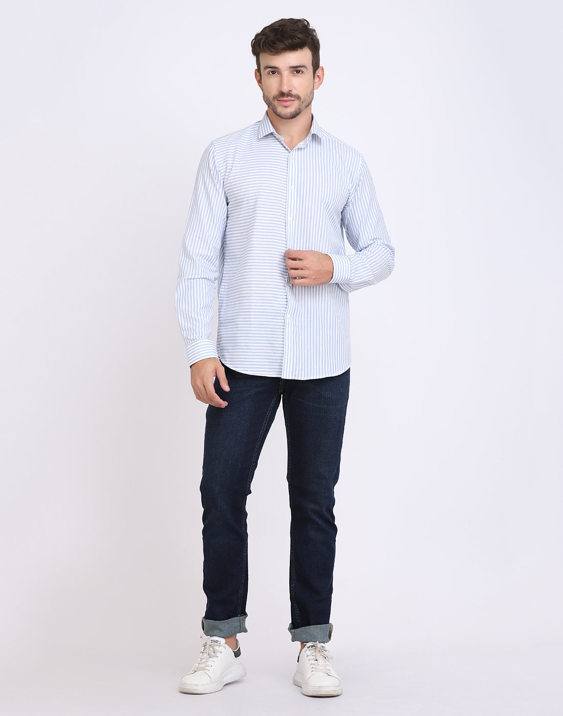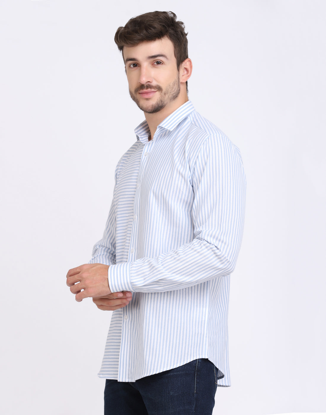 White & blue Cotton silver Lurex striped casual shirt has a spread collar,long sleeves, curved hem, Expand your collection of casual staples with this party shirt. A night at the movies/dinner party is perfectly well-styled by putting this silver Lurex piece with some slim trousers.