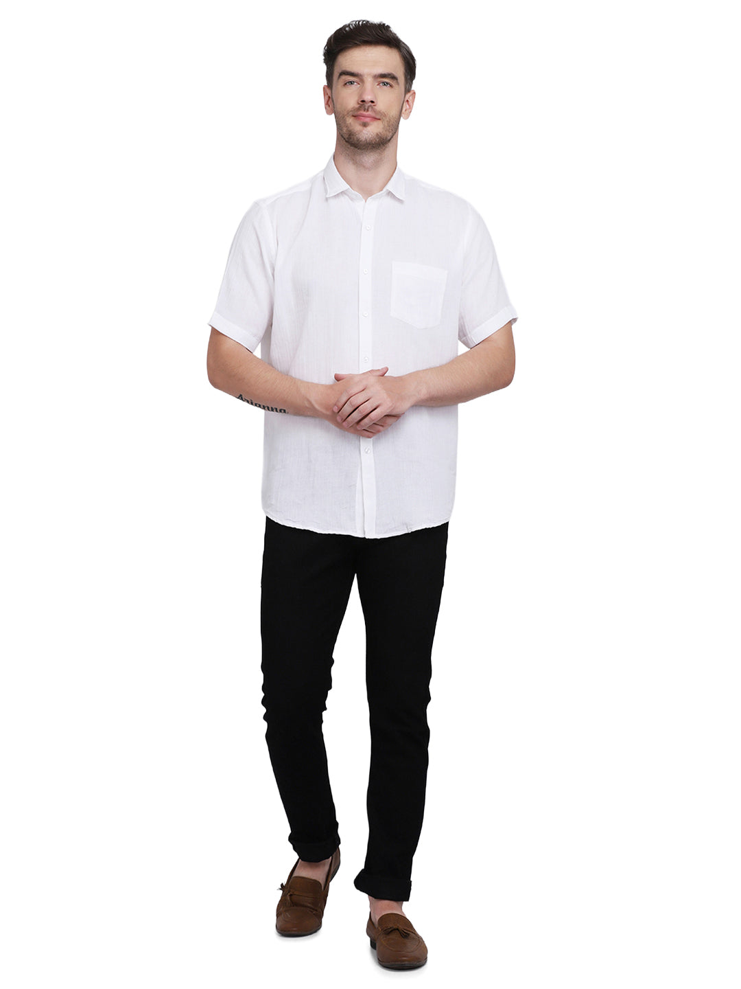 *Cotton Double cloth is a woven fabric made of two fine fabrics threaded together, This Super comfortable White regular fit formal shirt, has a spread collar,half sleeves, a chest pocket and curved hem, this shirt will give you the perfect amount of comfort and durability. When you're going out on a official meeting or dinner, match this White piece with chinos and a pair of formal loafers.