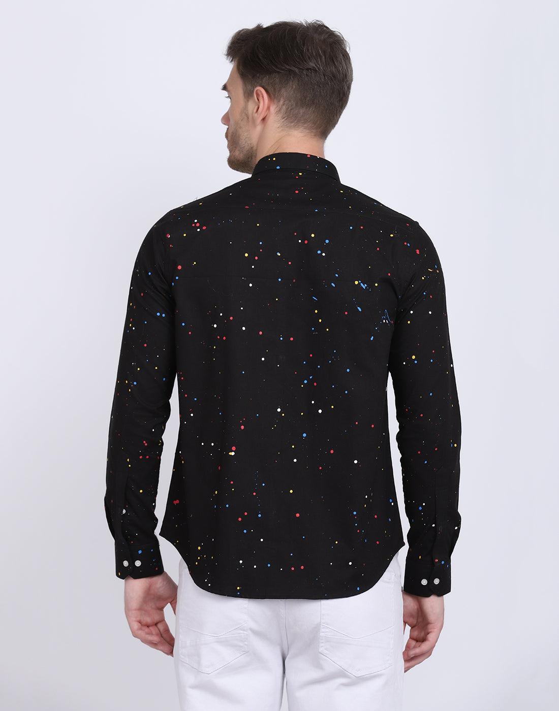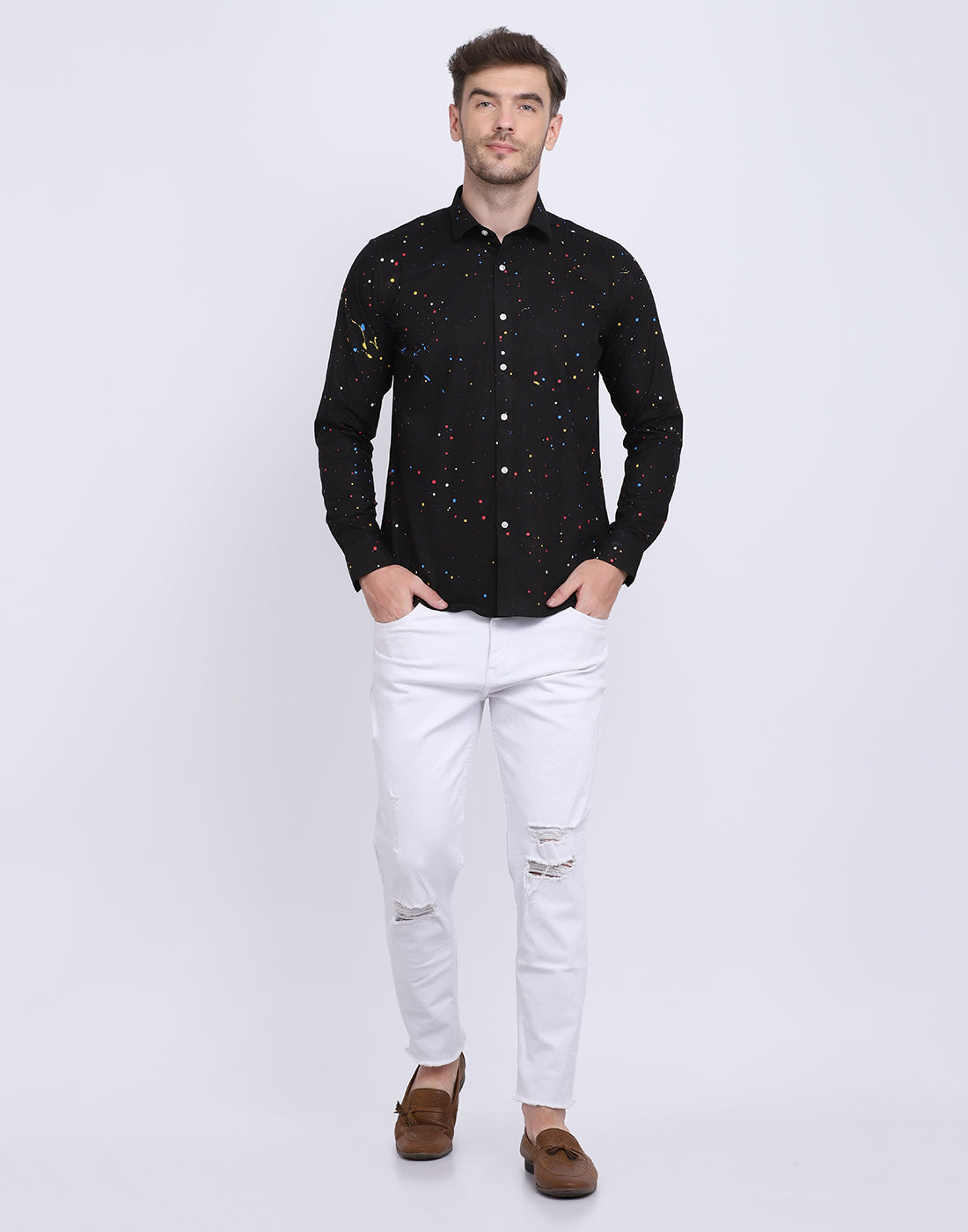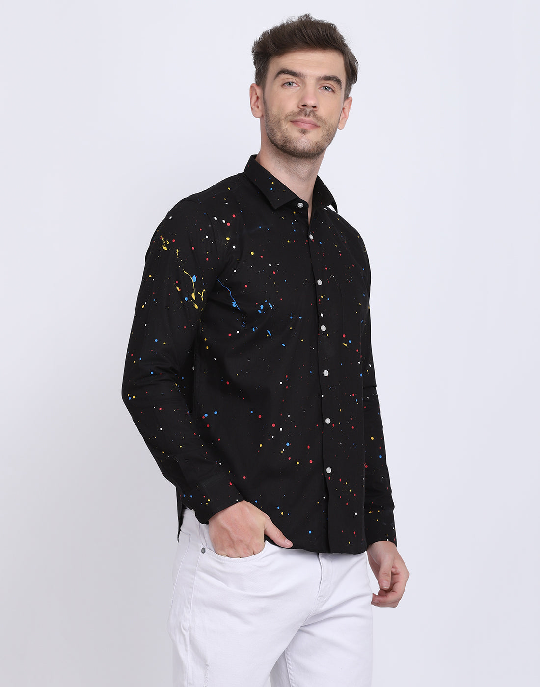 This black shirt has random Multicolored hand drop paint overall embellishment, regular fit shirt has a spread collar, long sleeves, and curved hem, this shirt will give you the perfect amount of festive and party looks. When you're going out on a weekend party, match this multicolored hand drop piece with stylish crop jeans and a pair of trendy shoes.