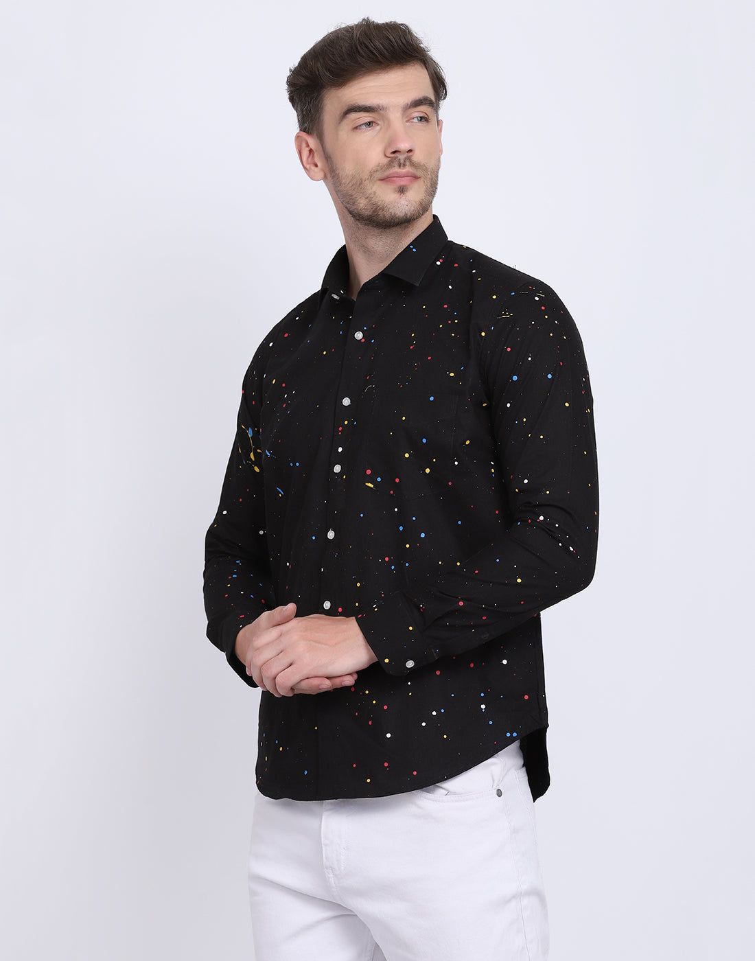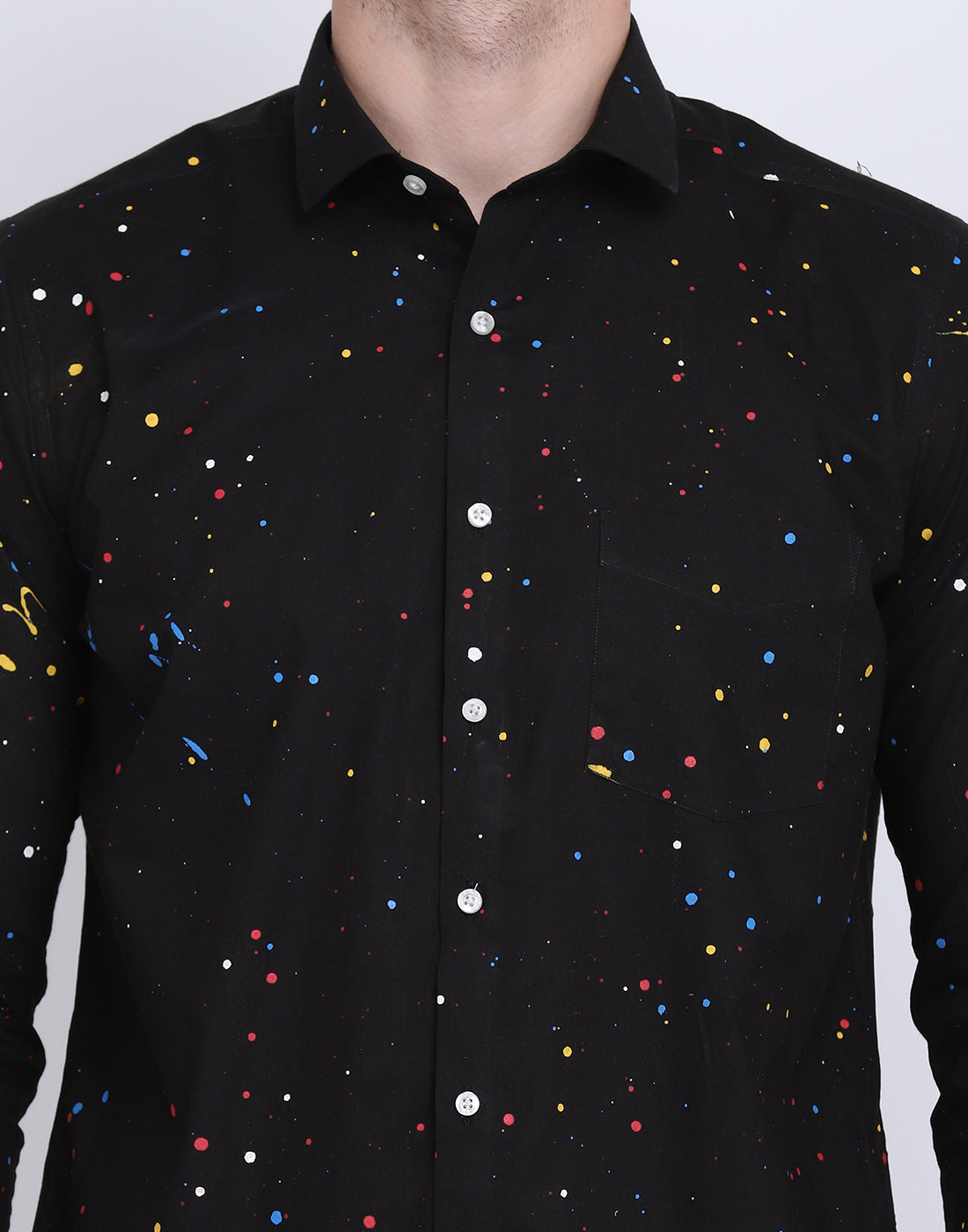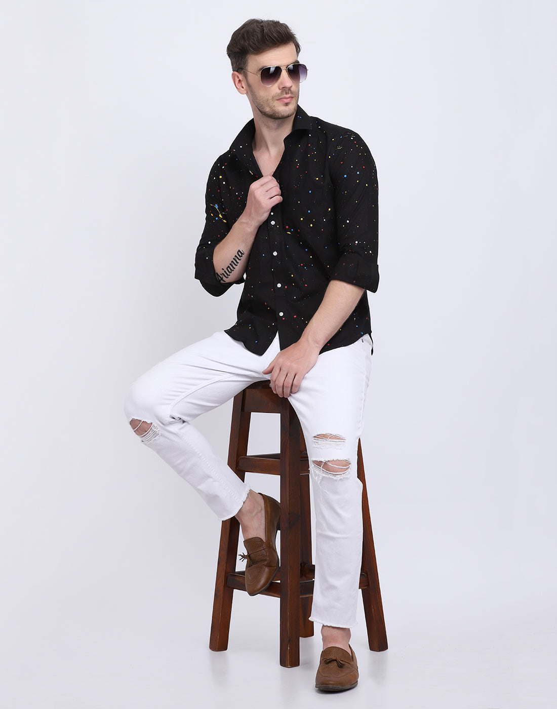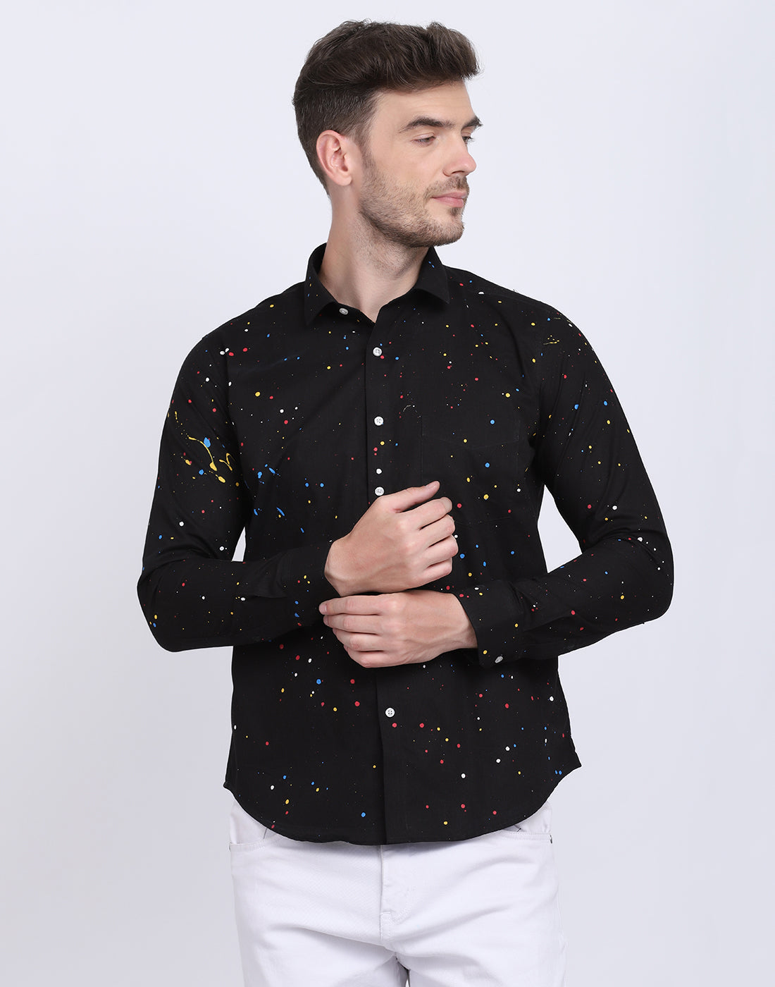 This black shirt has random Multicolored hand drop paint overall embellishment, regular fit shirt has a spread collar, long sleeves, and curved hem, this shirt will give you the perfect amount of festive and party looks. When you're going out on a weekend party, match this multicolored hand drop piece with stylish crop jeans and a pair of trendy shoes.