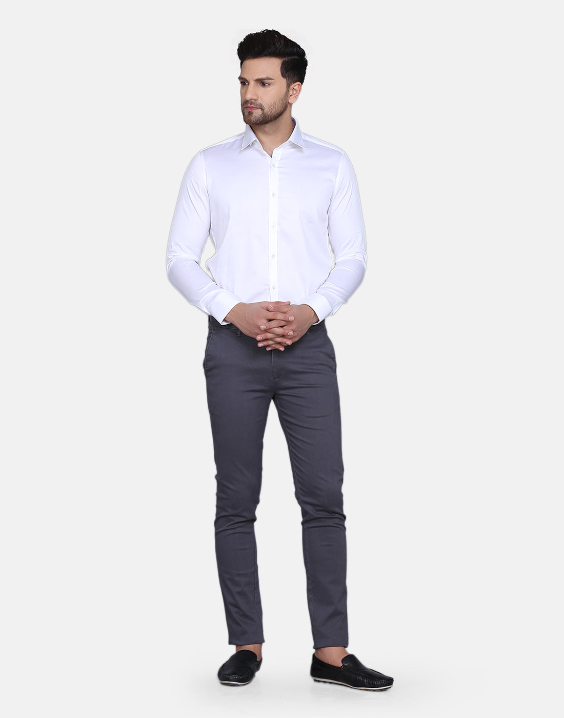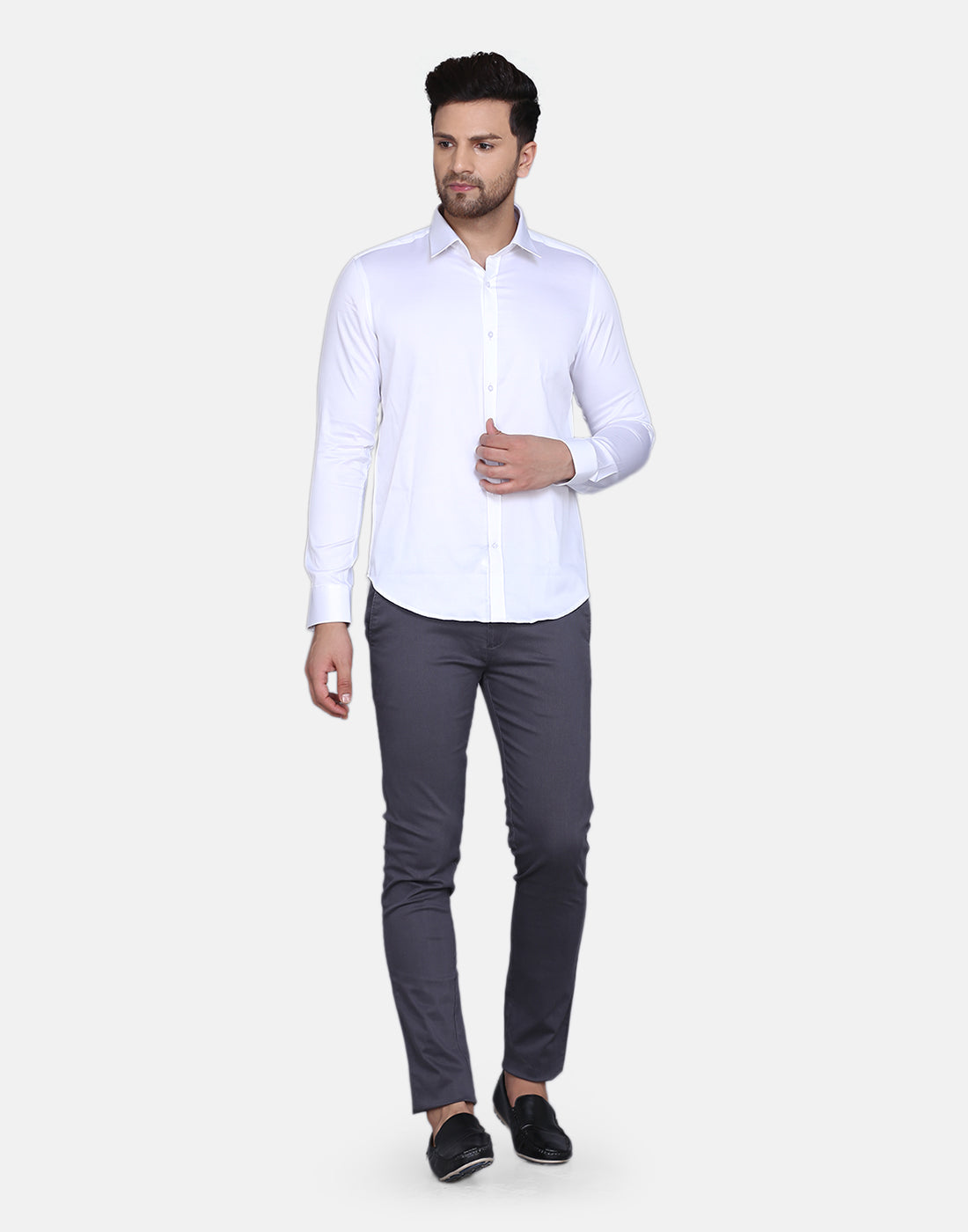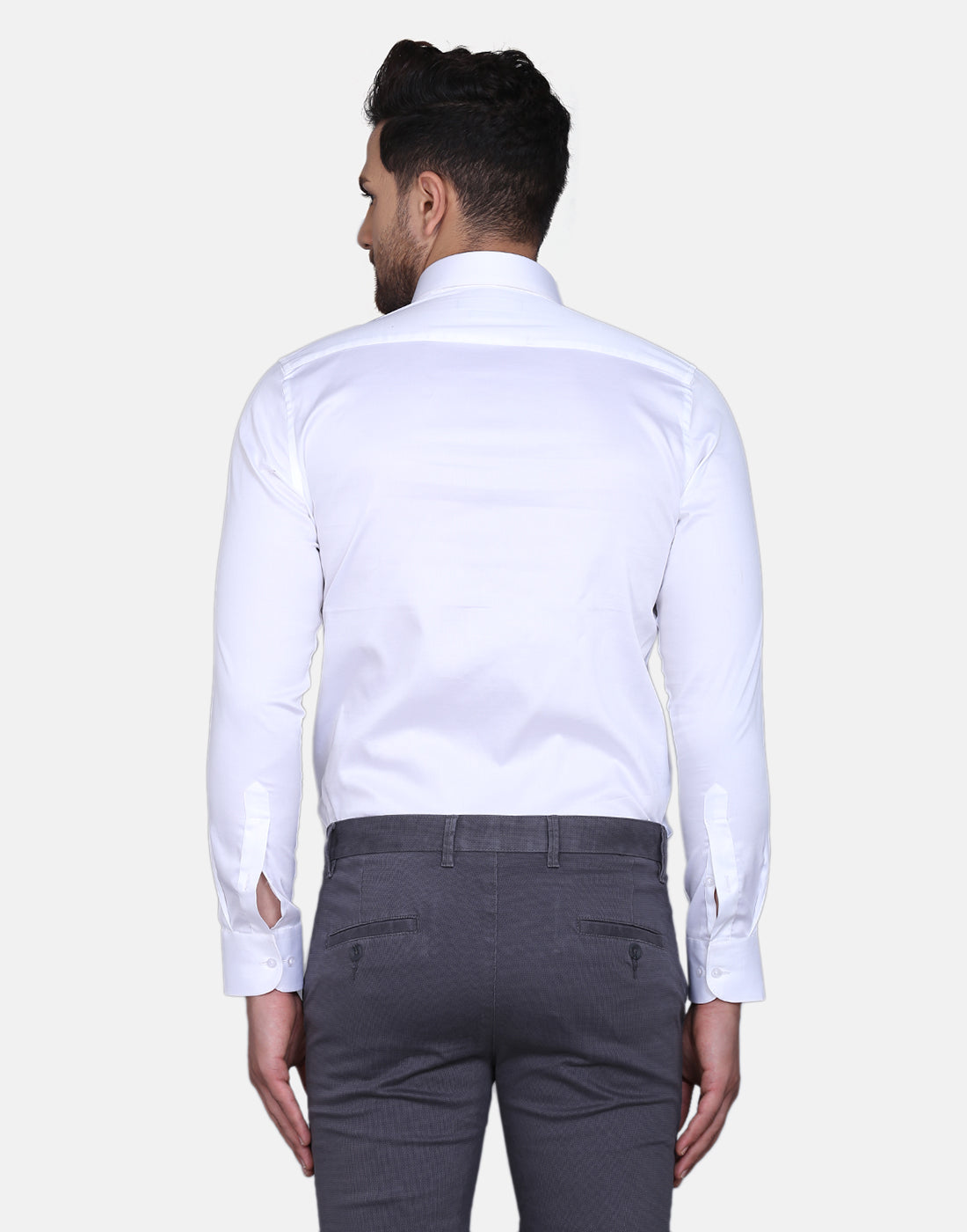 Cotton satin solid formal shirt, has a spread collar, long sleeves, and curved hem this white piece have taken the global runways by storm, so we thought we'd bring them to your closet as well, with this Very soft hand feel shirt. Get 'in line' with the trend with this bold and statement making style, that is crafted to perfection, with a fit that is just right! Office to the bar, make it work with a pair of formal Trouser or ripped jeans with loafers.